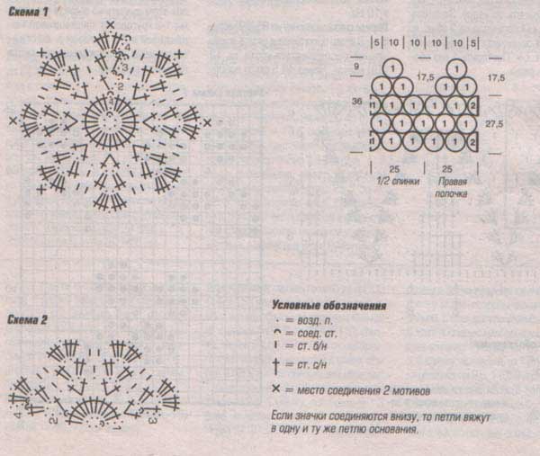 Полочки и спинка: связать 40 полных розеток и 4 полурозетки. Соединить их по выкройке.