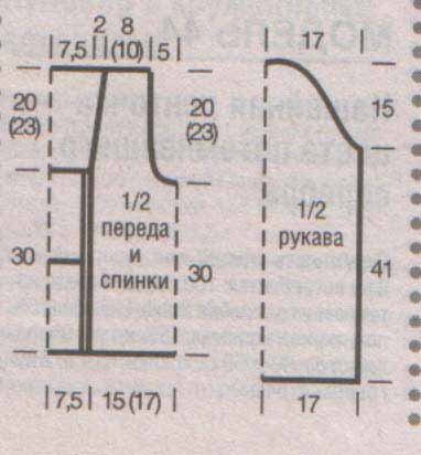 13 (15) п. - правая часть переда, закрыть 3 п., провязать 38 (41) п. - спинка,