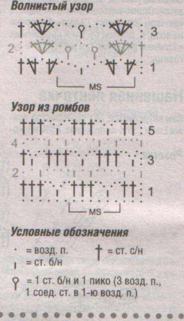и 10,5 р. = 10 х 10 см; волнистый узор: 15 п. и 8 р. = 10 х 10 см.