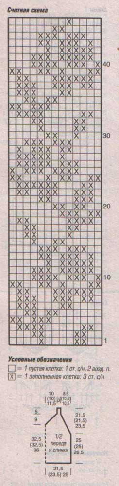 выреза оставить в каждом ряду 0 (0) 1 х 2 и 10 х 1 клетку. Через 41,5 (41,5) 45 см от наборного