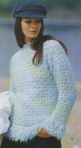 Вам потребуется: 700 (750) 800 г голубой пряжи (100% полиамида, 130 м/50 г); спицы и крючок № 4.