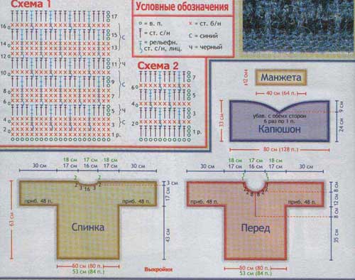 Капюшон обвязать крючком нитью темно-голубого цвета 3 р. ст. б/н. Пришить манжеты