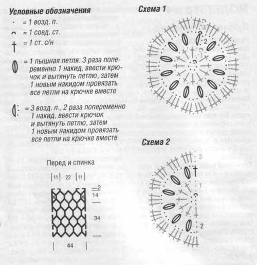 Перед и спинка: связать 39 розеток и 4 1\2 розетки, расположить их по выкройке и соединить соед.