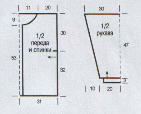 в 1-м р. 2 п. = 28 п. Одновременно прибавить для скосов рукава с обеих