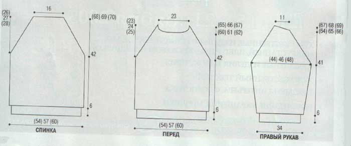 ПЕРЕД: вязать как спинку, кроме выреза горловины и реглана. Через 42 см от начала для линии реглана закрыть с обеих сторон в каждом 2р. (1 х 4 п., убавить на расстоянии 9 п. от края 4 х 2 п., 23 х 1 п.) 1 х 4 п., убавить на расстоянии 9 п. от края 6 х 2 п., 22 х 1 п. (1 х 4 п., убавить на расстоянии 9 п. от края 7 х 2 п., 23 х 1 п.). Одновременно через (60) 61 (62) см от начала для выреза горловины закрыть средние 18 п. и вязать каждую сторону отдельно: закрыть в каждом 2 р. 1 х 4 п., 2 х 3 п.,3 х 2 п.
