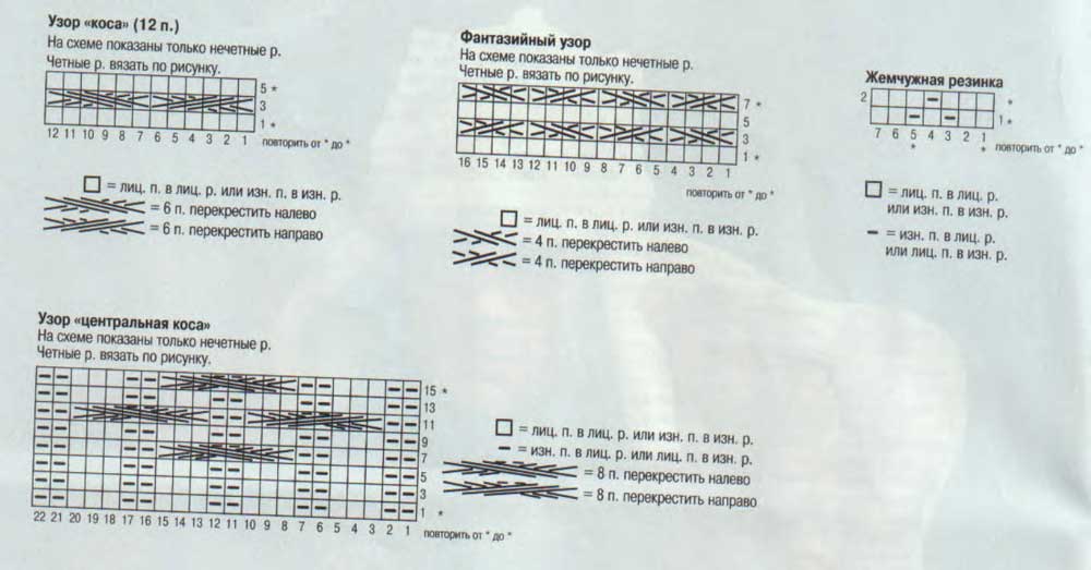 Фантазийный узор, узор «коса» слева и справа: вязать по схеме. 4 п. перекрестить налево: оставить 2 п. на вспом. спице перед работой, след. 2 п. провязать лиц., затем вязать 2 п. со вспом. спицы. 4 лиц. п. перекрестить направо: оставить 2 п. на вспом. спице за работой, след. 2 п. провязать лиц., затем вязать 2 п. со вспом. спицы.