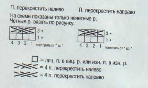 8 п. перекрестить налево: оставить 3 п. на вспом. спице перед работой, оставить след. 2 п. на вторую спицу за работой, след. 3 п. провязать лиц., затем провязать 2 п. со 2 вспом. спицы изн. и 3 п. с 1-й вспом. спицы лиц. п. 8 п. перекрестить направо: оставить 3 п. на вспом. спице за работой, оставить след. 2 п. на вторую спицу за работой, след. 3 п. провязать лиц., затем провязать 2 п. со 2 вспом. спицы изн. и 3 п. с 1-й вспом. спицы лиц. п.