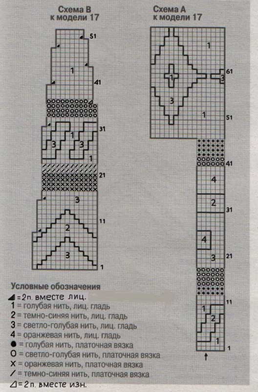 петли провязывать нитями обоих цветов, находящимися в работе. В ширину повторять каждый мотив узора.