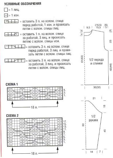 Узор с косами 1: вязать по схеме 1, на которой приведены только лиц. р., в изн. р.