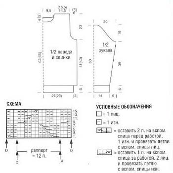 Рукава: набрать 38 п. и связать 6 см резинкой. Затем вязать основным узором следующим образом: кром., начать от стрелки А, повторить 3 раза раппорт, закончить у стрелки С, кром.