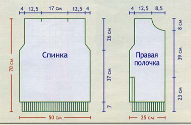 На высоте 62 см от начала вязания закрыть для выреза горловины в каждом 2-м р. 2 раза по 3 п., 2 п. и 2 раза по 1 п. На общей высоте 70 см закрыть 15 п. для плеча и закончить вязание.