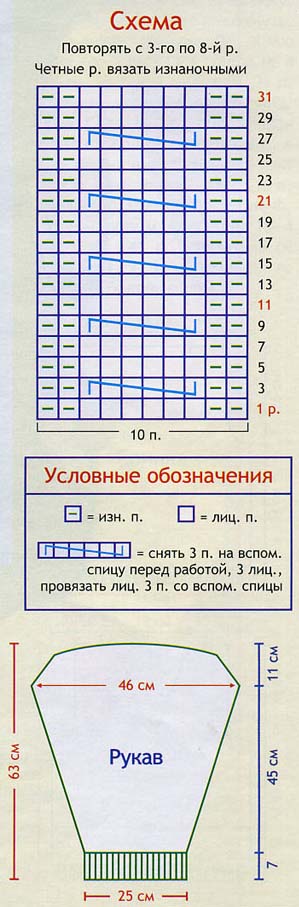 На высоте 52 см от начала вязания убавить для оката рукава с обеих сторон в каждом 2-м р. 5 раз по 1 п., зате м закрыть 5 раз по 3 п. и оставшиеся 16 п. Общая высота около 63 см.