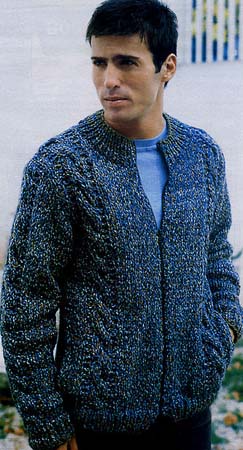 Вам потребуется: 750 г меланжевой пряжи сине-бежевого цвета и 100 г пряжи (50% шерсть, 50% акрил) средней толщины светло-коричневого цвета, разъемная застежка-молния длиной 60 см в тон.