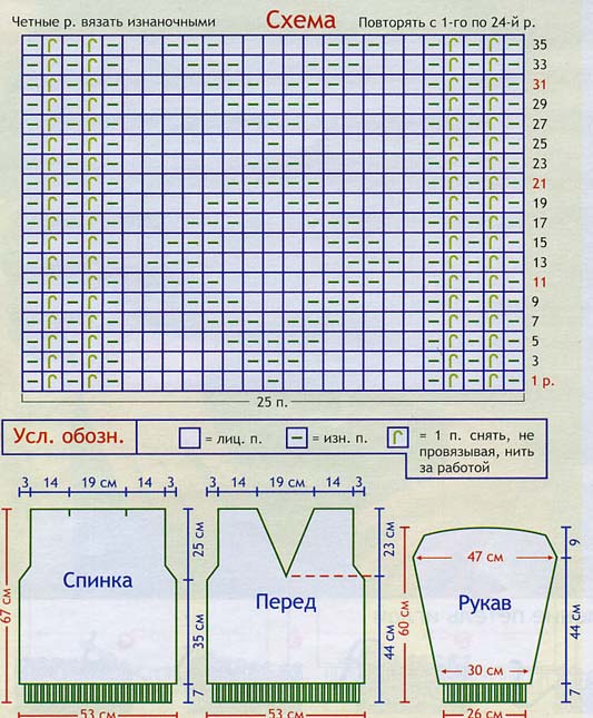 Продолжить вязание спицами № 5, распределив п. след. образом: 6 п. лиц. гладь, *25 п. по схеме, 7 п. лиц. гладь, повторять от* до конца р. и закончить 25 п. по схеме и 6 п. лицевой глади. На высоте 42 см от начала вязания убавить для пройм с обеих сторон в каждом 2-м р., отступив 2 п. от