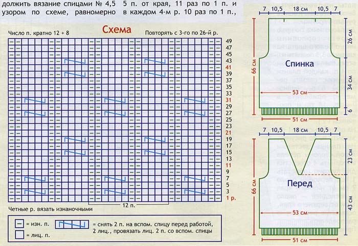 На спицы № 4 набрать 118 п. и связать 6 см резинкой 1х1. Продолжить вязание спицами № 4,5 узором по схеме, равномерно прибавив в 1-м изн. р. 10 п. = 128 п. На высоте 40 см от начала вязания закрыть для пройм с обеих сторон 5 п., в каждом 2-м р. 2 раза по 3 п., 2 раза по 2 п. и 2 раза по 1 п. = 94 п. На общей высоте 66 см закрыть по 25 п. для каждого плеча, 44 п. для горловины и закончить вязание.