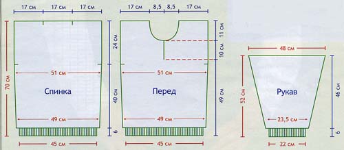 Одновременно прибавить с обеих сторон в каждом 16-м р. 3 раза по 1 п. = 118 п. На высоте 46 см от начала вязания нитью контрастного цвета наметить с обеих сторон проймы и вязать прямо. На общей высоте 70 см закрыть по 39 п. для каждого плеча, 40 для горловины и закончить вязание.