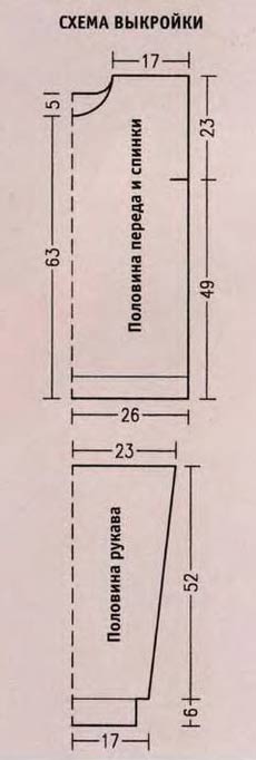 Перед: вязать, как деталь спинки, только линию выреза горловины начать формировать на высоте 63 см. В середине закрыть 12 п., затем по краям скоса в каждом 2-м р. убавить еще 1 раз по 5 п., 1 раз по 3 п. и 2 раза по 1 п.