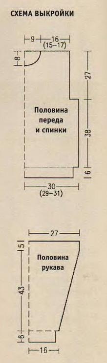 Для линии выреза горловины на высоте 63 см в середине закрыть 13 п., затем по краям скоса еще 1 раз по 5 п., 1 раз по 4 п., 1 раз по 3 п., 1 раз по 2 п. и 3 раза по 1 п. Петли плеч закрыть на высоте 71 см.