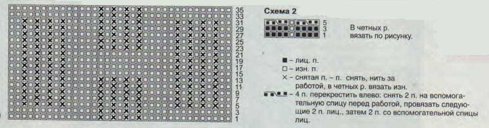 1 кром. п., 9 п. узор 2, 35 п. узор 1, 9 п. узор 2, 1 кром. п. Для скосов прибавить с обеих