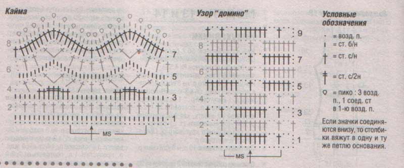 Сборка: связать на боковые и нижний края, начав с правой стороны, кайму по схеме от стрелки. В 1-м р.
