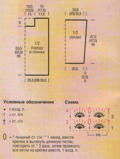 Рукава: связать цепочку из 49 возд. п. + 1 возд. п. подъема и вязать основным узором в
