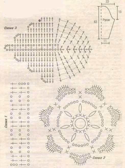 Рукав: наберите косичку из в. п. длиной 22 см. Вяжите полотно рукава филейной сеткой, равномерно