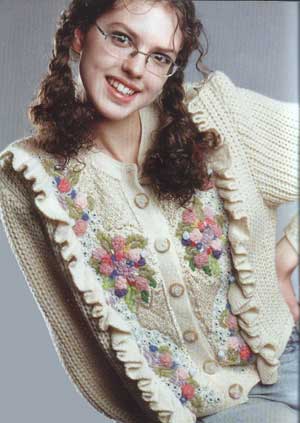 15 п. х 30 р. = 10 х 10 см, связано полупатентной резинкой на спицах № 4.